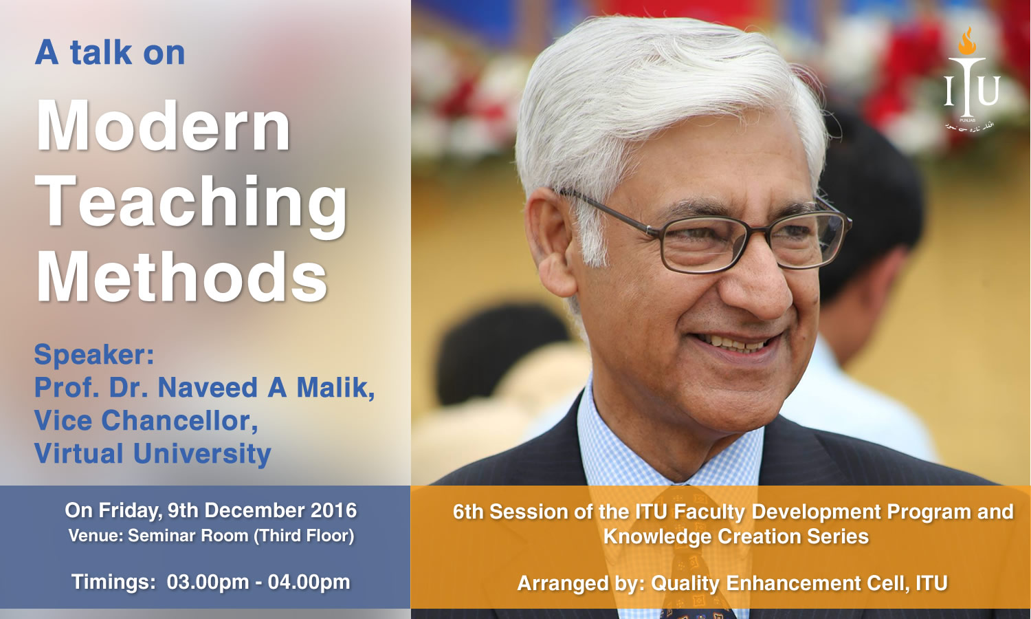ITU is pleased to invite you to the talk “Modern Teaching Techniques” by Prof Dr Naveed A Malik (SI). Rector, Virtual University of Pakistan. He will focus more on modern teaching style, class management, teaching materials preparation, student engagement through questioning and generating discussion and interest in learning. He will also be focusing on outcome based learning, and appropriate use of technology in teaching.