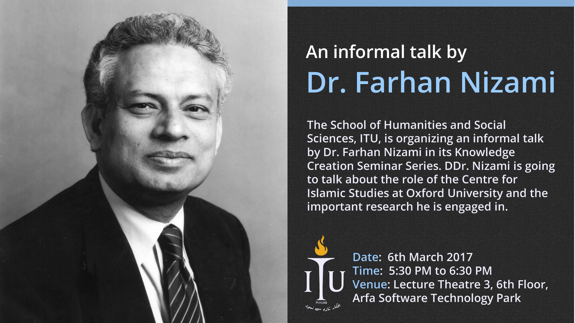 The School of Humanities and Social Sciences, ITU, is organizing an informal talk by Dr. Farhan Nizami in its Knowledge Creation Seminar Series. Dr. Nizami would talk about the role of the Centre for Islamic Studies at Oxford University and the important research Dr Nizami is engaged in there.